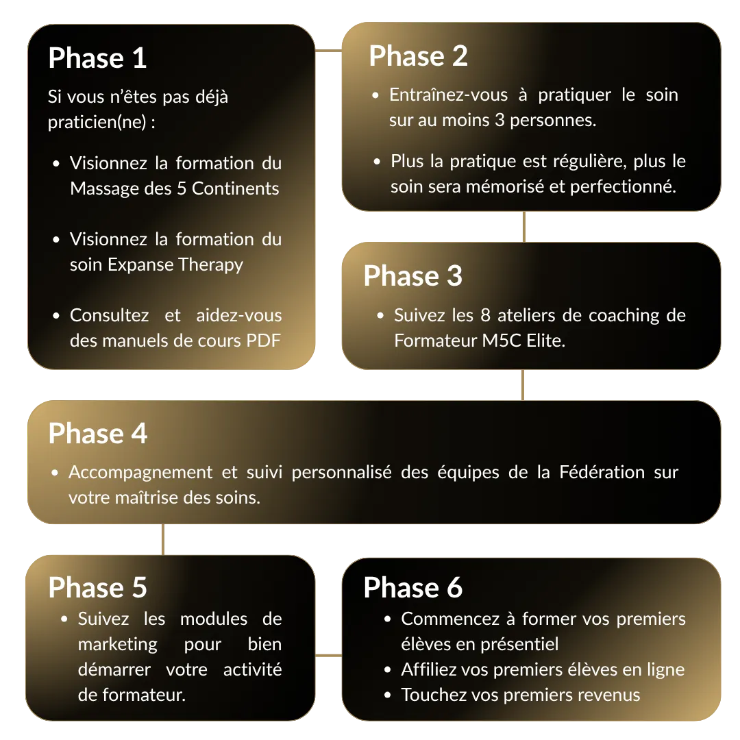 Vous pouvez opter exclusivement pour la formation de formateur M5C, centrée sur la maîtrise et la transmission de la méthode M5C, ou bien choisir une voie plus complète en suivant la formation de formateur M5C et Expanse Therapy, qui vous permettra d’intégrer et de diffuser les deux approches de manière complémentaire.